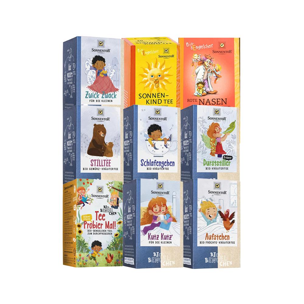 | Sorte | Sonnenkindtee 20 Btlx1,5g, Rote Nasen Clown Tee 20 Btlx1,5g, Probier Mal! 20 Btl, Zwick Zwack für die Kleinen 20 Btl, Still Tee 20 Btl, Schlafengehen Tee 20 Btl, Kutz Kutz für die Kleinen 1,2g 18 Btl, Durststiller Kräutertee 20 Btl, Aufstehen Tee 20 Btl |